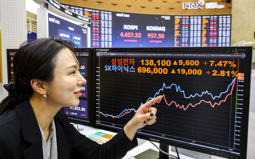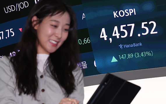 코스피, 4450선 첫 돌파…코스피도 4년만 최고치 삼성전자, 7% 급등 마감…'14만전자' 목전[핫스탁](종합) 코스피 4457.52(▲3.43%), 코스닥 957.50(▲1.26%), 원·달러 환율 1443.8원(▲2.0원) 마감[시황]