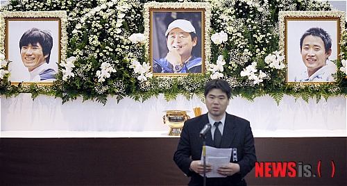 【서울=뉴시스】강진형 기자 = 히말라야 안나푸르나에서 '코리안 루트'를 개척하다 지난달 18일 실종된 고(故) 박영석 대장과 신동민, 강기석 대원의 합동영결식이 열렸다. 3일 오전 서울 종로구 서울대학교 병원 장례식장에서 유가족이 참석자들에게 인사말을 전하고 있다. [email protected]