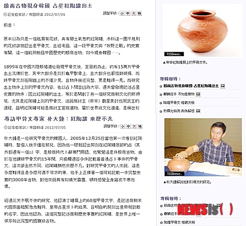 【서울=뉴시스】이예슬 기자 = 대만 신생보(新生報)가 은나라 마지막 황제 제신(帝辛)이 '목야(牧野)의 전쟁' 직전 별점을 치고, 그 점괘를 새겨 남긴 홍도관을 전면 특집으로 보도했다. 제목(殷商古物現身韓國 占星紅陶罐出土) 아래 7개 서브타이틀(前言, 輾轉經手 不知是寶物, 陶罐甲骨文 暗藏天機, 熱釋光檢測 真偽解惑, 殷古物 總算驗明正身, 歷史價值 金錢難衡量, 專訪甲骨文專家 朴大鍾: 紅陶罐 來歷不凡)로 대서특필했다. ◇은나라 유물 한국에 현신(現身), 별점이 기록된 홍도관 출토 원래는 단지 어깨부위에 꽃무늬가 있는 일개 화병으로만 여겨졌던 향토적 홍도관이었다. 처음엔 그 둘레에 원형으로 새겨진 불규칙적 꽃무늬가 곧 갑골문임은 명확히 인지되지 않았다. 고증을 거치면서 이 일단의 갑골문은 역사적 '목야(牧野)의 전쟁' 사실과 관련이 있고 이 물건은 중국역사의 은상 유물인 것으로 능히 검증돼 현재 한국에 현신(現身)했다. 1899년 중국대륙 은허 유적지에서 발견된 갑골문 이후 지금까지 약 15만 편의 갑골이 출토돼 세상에 전해 내려왔다. 그런데 그 중 대부분은 귀갑수골 위에 새겨진 것이고 또한 대부분은 모두 파손된 불완전한 것들이며, 도기상에 새겨진 갑골문은 드물 뿐만 아니라 물건이 거의 완정에 가까운 것은 더욱 보기 어렵다. 그리고 출토된 물건 위에 새겨진 갑골문 내용을 연구해보면 점복으로써 길흉을 묻는 것이 주류를 이루고 있는데 아직까지 별점 사실(史實)을 기술한 물건은 발견되지 않았다. 그런 관계로 은(殷) 주왕(紂王) 홍도관의 출토는 별도로 상조문화의 신영역에 대한 일개 연구를 개창하는 것이 된다. 특히 홍도관 상에 새겨진 갑골문은 상나라 주왕이 별자리 모양을 관찰하고 주나라 무왕을 토벌하는 과정을 서술하고 있어, 이 홍도관이 상나라 주왕의 왕실유물일 수 있음을 증명, 가히 일건의 세계급 문화유산이자 세상에 보기 드문 진귀한 물건이라 할 수 있어, 그 중요성 및 역사 형성에 대한 충격은 모두 사람들을 놀라게 하고 과소평가할 수 없게 만든다. ◇여러 손으로 옮겨가는 동안 보물인 줄 몰랐다 한국인 골동품 수집가인 안 선생은 중국대륙을 자주 다닌 사람으로, 1992년 또는 1993년 요녕성 부신(阜新)시 외곽지역에서 현지 골동상으로부터 1차로 물건들을 구입했는데 그 중에 이 홍도관이 포함돼 있었다. 그 후 안 선생은 이 물건을 요녕성 심양시 만융촌 내 거주지에 보관해두었다. 2005년 7월20일 전후로 안 선생은 이 홍도관을 또다른 한국인 골동품 수장가인 석 선생에게 팔았고, 석 선생은 8월18일 홍도관을 여행용 가방에 넣어 중국 북경공항에서 X레이 검색을 받은 뒤 북방항공편을 이용해 한국 인천공항으로 들여왔다. 홍도관이 한국에 도착한 이후 석 선생은 또 8월 말에 또다른 김 선생에게 팔았고, 접수자인 김 선생 또한 현재 소장자인 조 선생에게 소유권을 양도했다. 이러한 일련의 이동 과정 중에서 소유인 모두는 홍도관 상에 새겨진 것을 단지 꽃무늬가 수려하고 독특하다라고만 생각했지, 그 특별한 의의와 가치는 진정으로 인식하지 못했는데 현재 소장자인 조 선생 또한 마찬가지였다. 조 선생은 홍도관을 획득한 후에도 특별히 중시하지 않고 단지 일반가정에 진열해놓았다. 텔레비전 받침대 위에 놔둬 평시에는 그것을 수장함(收藏盒)이 되게 하고 손길가는대로 일부 잡동사니와 어린 아들의 장난감들을 담아놓았다. 2005년 12월24일 저녁시간, 조 선생은 TV를 보는 도중, 동시에 시선이 이 홍도관에 이르렀는데, 곧 그것을 손으로 붙잡고 자세히 한 번 감상을 하게 되었다고 한다. 이때 그는 문득 이 독특한 꽃무늬가 중국 고문자와 닮았고, 만일 그렇다면 이 홍도관은 진정한 골동품일 수 있음을 경각(驚覺)했다. 또한 이 고문자에 대해 도대체 무슨 뜻인지 호기심으로 가득 찼다. 이에 이튿날 그는 즉시 대종언어연구소 박대종 소장을 찾았고 그때부터 홍도관이 갖는 진정한 신분의 역정(歷程)을 탐색하기 시작했다. ◇천기가 암장된 제신홍도관(帝辛紅陶罐) 갑골문 갑골문은 일종의 매우 중요한 고한자(古漢字) 자료이다. 절대 부분은 은허에서 발견됐는데 기본적으로는 모두 은상왕조 통치자의 점복기록이다. 은허는 저명한 은상시대 유적지로 그 범위는 하남성 안양시 서북 소둔촌, 화원장, 후가장 등지를 포괄한다. 이곳은 일찍이 은상 후기 왕조들의 도성 소재지인 까닭에 은허라 불리운다. 홍도관에는 모두 61개의 갑골문자가 새겨져 있는데, 그 중 ‘占(그 외부에는 囗이 있음)’자 하나는 바닥부위에 있고, 나머지 60개 글자는 도관 견부에 있는데, 중복된 부분을 제외하면 총 49자이다. 도관 견부의 60개 글자들은 각자 모두 하나의 완전한 원을 형성하고 있는데 결코 조금의 간격도 없이 단원횡행(單圓橫行) 방식으로, 우측에서 좌측 방향으로 서사돼 있다. 그 주요사항은 성상(星象)을 관찰하고 전쟁결과를 추구한 내용이 기록돼 있다. 연구에 따르면 '주왕(紂王)'이라고도 하는 은상 최후의 황제 '제신(帝辛)'의 재위 만기 시에 '태백경천'이라고 하는 금성의 이상 현상이 나타났다. 이는 반란 및 국가기강을 파괴하는 대흉조였으니 은상으로서는 