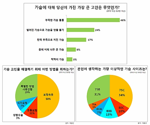 이어 24%(51명)가 ‘벌어진 가슴으로 아름다운 클리비지(가슴골) 연출 불가’, 탄력 부족으로 처진 가슴은 17%(36명)로 3위, 몸에 비해 너무 큰 가슴 8%(16명), 짝짝이 가슴 5%(11명) 순으로 조사됐다.