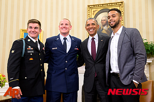 【워싱턴=AP/뉴시스】차의영 기자=지난 달 프랑스 파리행 고속 열차에서 총기와 칼로 무장한 테러범을 제지해 세계적 영웅이 되었던 세 미국 청년이 17일(현지시간) 버락 오바마대통령의 초청을 받아 말쑥한 차림으로 백악관을 방문했다.