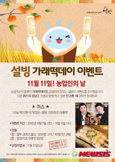 행사는 설빙 공식 페이스북(facebook.com/sulbing)에서 진행하며 '나눠 먹으면 더 맛있는 설빙 OO치즈가래떡'의 정답을 댓글과 함께 먹고 싶은 친구를 태깅하면 된다.