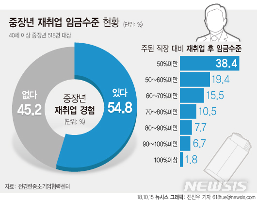 【서울=뉴시스】이종희 기자 = 재취업 경험이 있는 40세 이상 중장년 10명 중 4명은 재취업후 임금이 이전 직장보다 50% 이상 감소했다는 조사결과가 공개됐다.