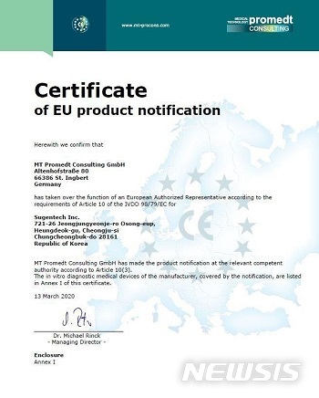 【서울=뉴시스】신항섭 기자 = 수젠텍은 혈액으로 10분내 코로나19 감염여부 신속으로 진단할 수 있는 신속진단키트 3종의 유럽CE 인증을 획득했다고 16일 밝혔다.