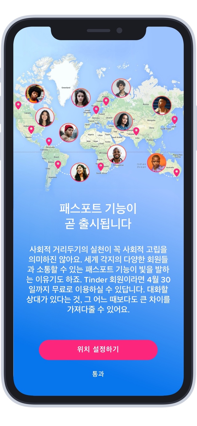 [서울=뉴시스] 이진영 기자 = 글로벌 데이팅앱 틴더가 전 세계인과 매칭해 대화할 수 있는 ‘패스포트’ 기능을 4월 한달 간 무료로 제공한다고 2일 밝혔다.