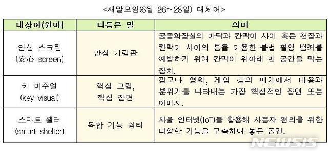 이와 함께 '안심 스크린(screen)'의 대체어로는 ‘안심 가림판'을 제시했다. 안심 스크린은 공중화장실의 바닥과 칸막이 사이나 천장과 칸막이 사이의 틈을 이용한 불법촬영 범죄를 예방하기 위해 칸막이 위아래 빈 공간을 막는 장치를 뜻한다.