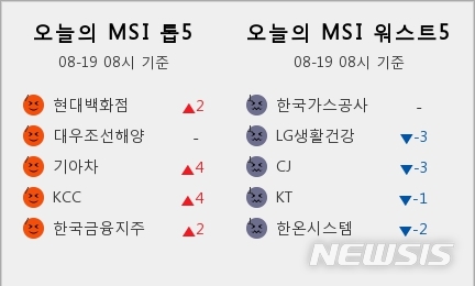 [서울=뉴시스] 류병화 기자 = 19일 빅데이터 시장심리지수(MSI)가 가장 높은 톱5에 현대백화점·대우조선해양·기아차·KCC·한국금융지주가 선정됐다.