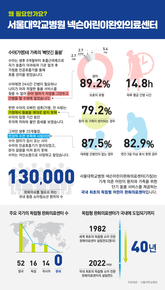 중증 소아환자를 돌보는 가족은 24시간 지속돼야 하는 간병으로 인해 개인 생활이 거의 불가능한 것이 현실이다. 실제로 중증 소아환자의 보호자를 대상으로 한 설문조사에서 응답자의 82.9%가 환자를 돌봐줄 사람이 없거나 환자를 맡길 수 있는 적합한 시설이 없는 등의 이유로 최근 1년 동안 3일 이상의 휴식을 취한 적이 없다고 응답한 바 있다.