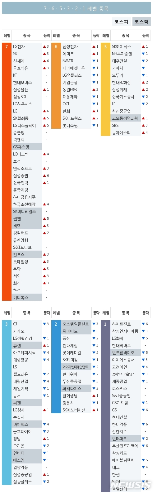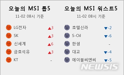 [서울=뉴시스] 이승주 기자 = 2일 빅데이터 시장심리지수(MSI)가 가장 높은 톱5에 LG전자·SK·신세계·금호석유·KT가 선정됐다.