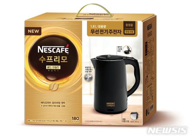 롯데네슬레코리아는 올 겨울 한정판으로 프리미엄 커피믹스 '네스카페 수프리모 골드 마일드'와 1.8ℓ 대용량 무선주전자로 구성된 '네스카페 수프리모 주전자 기획팩'을 선보였다. '네스카페 수프리모'는 프리미엄 원두인 에티오피아산 골드빈에 네스카페만의 독자적인 골드락 기술을 더한 프리미엄 커피믹스다. 증정품 무선주전자는 1.8ℓ의 대용량으로 활용도가 높고, 원터치 오픈형 뚜껑과 위생적인 스테인리스 스틸과 플라스틱 이중 단열 구조를 적용해 편리하고 안전하게 사용할 수 있다. 또 심플한 블랙 컬러를 적용하여 모던한 주방 분위기를 연출할 수 있다.