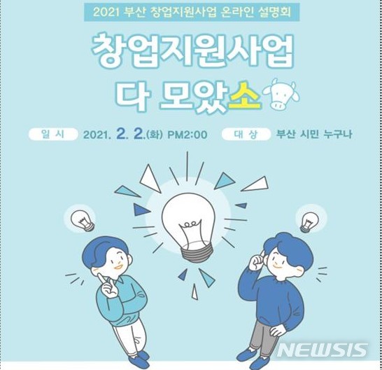 [부산=뉴시스] 허상천 기자 = 부산시는 부산중소벤처기업청과 공동으로 2일 오후 2시부터 100분 동안 지역 내 11개 창업지원기관들과 함께 ‘2021년 부산 창업지원사업 온라인 설명회’를 개최한다고 1일 밝혔다.