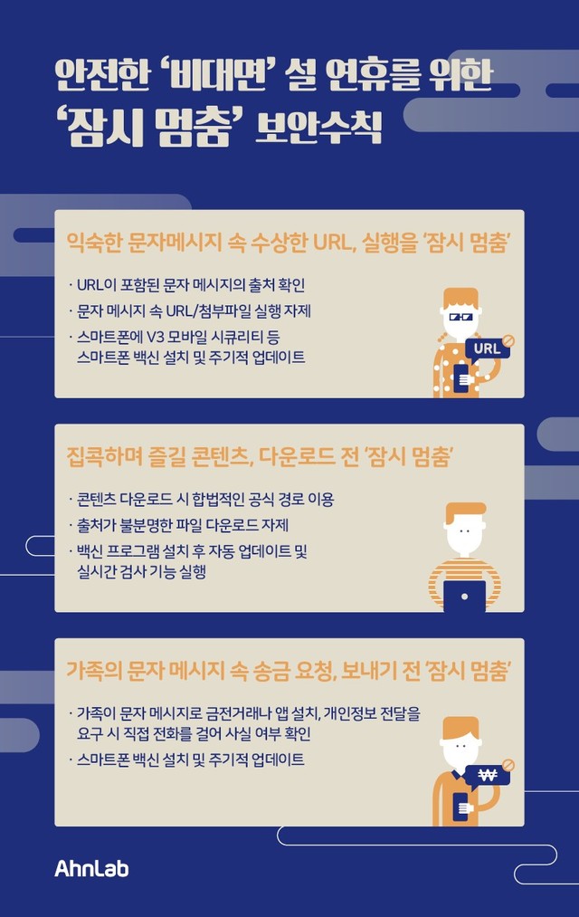 코로나19의 지속적인 확산에 따라 강화된 방역 수칙으로 ‘비대면’ 설 연휴가 예상되는 가운데, 안랩이 안전한 설 명절을 보내기 위한 ‘잠시 멈춤’ 보안수칙을 발표했다.