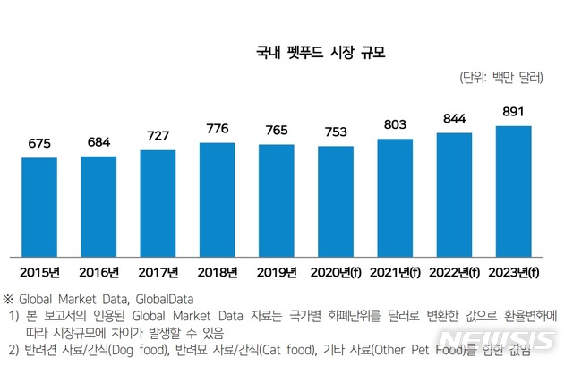 유로모니터 자료에 따르면 2020년 국내 펫푸드 시장 규모는 약 1조2650억원(건식사료, 습식사료, 간식 포함)에 이를 것으로 전망된다. 반려견 사료 시장 규모는 약 7923억원, 반려묘 사료 시장 규모는 약 4728억원으로 추정된다.