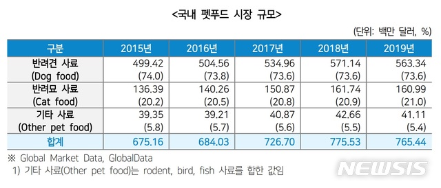 지난해 기준 펫푸드 수입액은 2억7073만 달러로 전년대비 11.9% 증가했다. 이중 반려견 사료는 1억7714만 달러로 65.4%, 반려묘 사료는 9360만 달러로 34.6%를 차지했다.