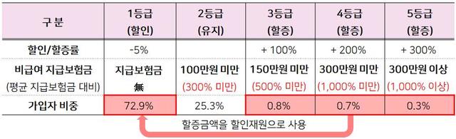 예컨데 비급여 지급 보험료가 100만~150만원 정도인 3등급과 300만원 미만인 4등급, 300만원 이상인 5등급의 할증률은 각각 100%, 200%, 300%가 적용된다. 반면 비급여 지급보험료가 100만원 미만인 2등급은 보험료가 유지되고, 지급보험료가 없는 1등급은 할인을 받게 된다. 할인율은 5% 내외다. 할증 등급이 적용되는 3~5등급 가입자는 전체 가입자의 1.8%로 예상된다.