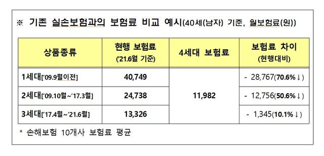 예컨데 우리나라 평균 40세 남성의 월 보험료 평균이 1세대 4만749원, 2세대2만4738원, 3세대 1만3326원이었다면, 4세대 실손의 경우 1만1982원으로 낮아진다.