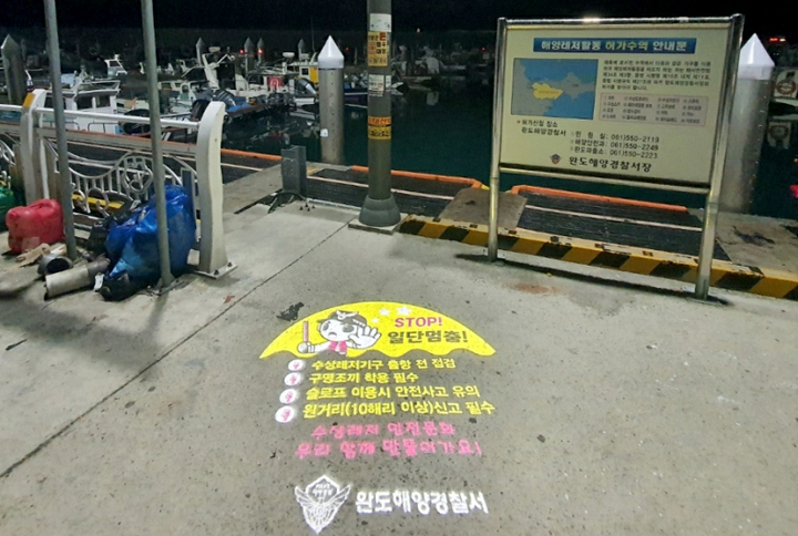 완도해경 관계자는 "로고젝터는 어두운 야간에도 안전 수칙을 상기시킬 수 있는 유용한 시설물이다. 안전사고 예방에 효과가 있을 것으로 기대한다"며 "앞으로도 수상레저 사고 예방과 안전 문화 확산에 최선을 다하겠다"고 말했다.