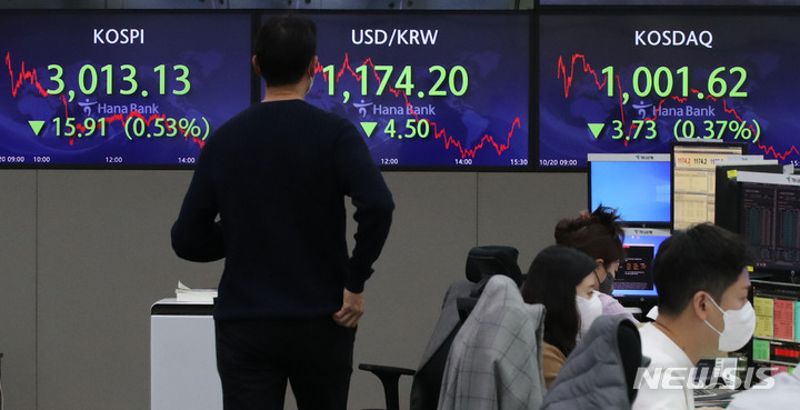 [서울=뉴시스]이주혜 기자 = 코스피가 개인의 매도세에 3010선에서 후퇴하며 장을 마감했다. 코스닥은 기관과 외국인의 동반 매도에 하락하며 1000선이 붕괴했다.