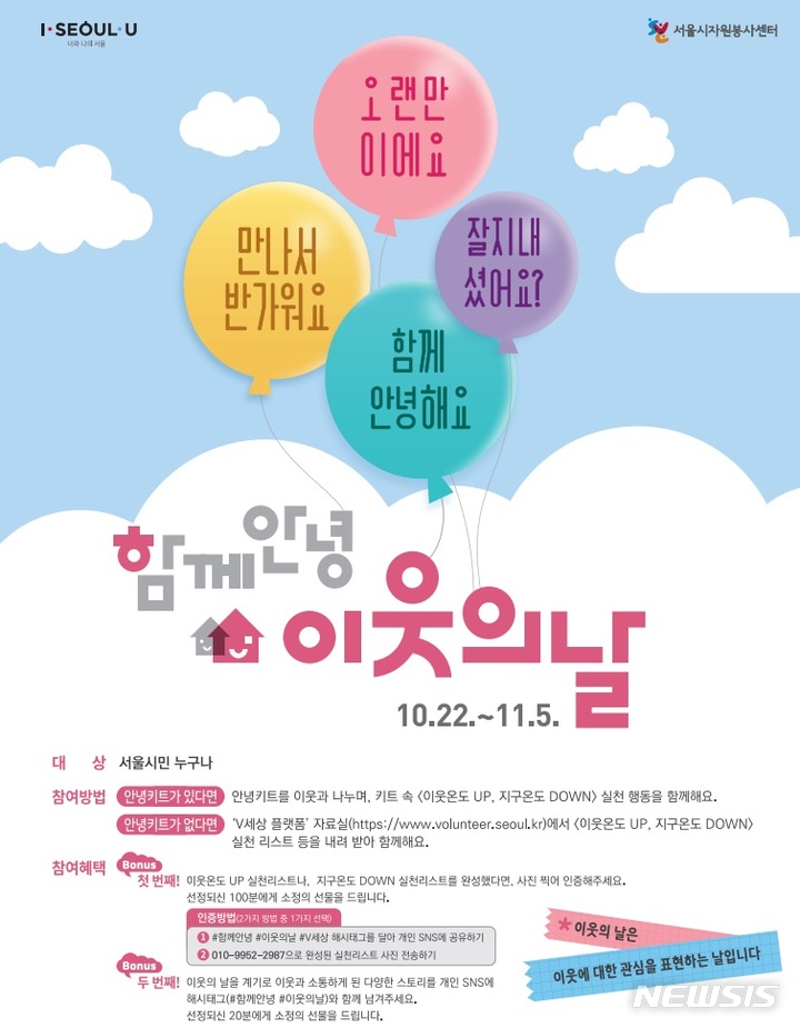 [서울=뉴시스] 이종희 기자 = 서울시자원봉사센터는 다음달 5일까지 2주간을 '이웃 주간'으로 설정하고 코로나19로 멀어진 이웃과의 관계를 회복해나가는 '함께 안녕! 이웃의 날' 캠페인을 진행한다고 22일 밝혔다.
