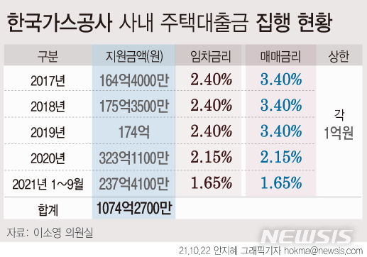 22일 뉴시스가 이소영 더불어민주당 의원실을 통해 확보한 자료에 따르면 가스공사 임직원이 지난 2017년부터 올해 9월까지 받은 사내 대출액은 총 1074억2700만원이다. 주택 구매용과 전·월세 임차용이 모두 포함된 금액이다. 가스공사는 이 중 구매용의 비중이 얼마나 되는지는 공개하지 않았다.
