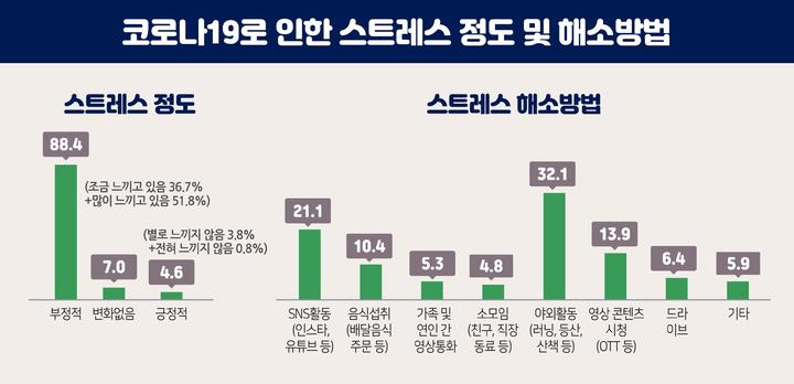코로나19에 따른 스트레스 정도를 묻는 질문에 ‘많이 느끼고 있음’이 51.8%로 가장 많았고, ‘조금 느끼고 있음’ 36.7%로 부정적인 감정이 88.4%를 차지했다. ‘변화없음’은 7%, ‘느끼지 않는다’는 4.6%에 불과했다.
