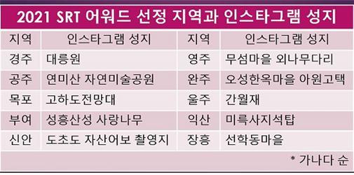 [대전=뉴시스] 김양수 기자 = 수서발고속철도를 운영하는 SR의 차내지 'SRT 매거진'의 '2021 SRT 어워드'에서 경주·공주·목포·부여·신안·영주·울주·완주·익산·장흥 등 10개 지역이 선정됐다.