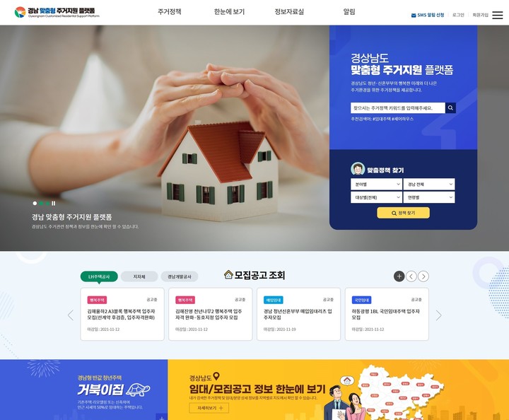 이에 경남도는 정보 수집의 불편 해소와 이용자의 주거정책 접근성을 높이기 위해 '경남 맞춤형 주거지원 플랫폼'을 구축한 것이다.