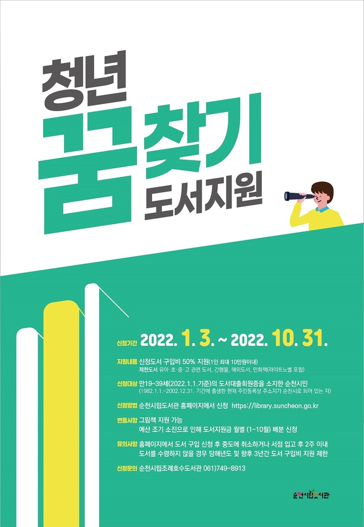순천시 도서관 관계자는 "청년들이 각자의 꿈에 다가가는 좋은 기회가 될 수 있는 독서를 장려하기 위해 도서구입비를 지원하고 있으니, 청년들이 책을 읽는 시간을 많이 가지길 바란다"고 말했다.