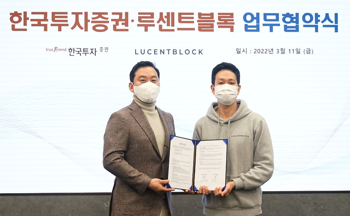 [서울=뉴시스] 이정필 기자 = 한국금융지주 자회사 한국투자증권은 루센트블록(Lucent Block)과 업무협약(MOU)을 체결하고 전략적 투자를 추진한다고 14일 밝혔다.
