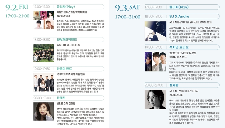 9월 2일에는 ▲장혜진 ▲한윤미 밴드 ▲SW재즈빅밴드 ▲플리지(Plzy)가 무대에 오른다.