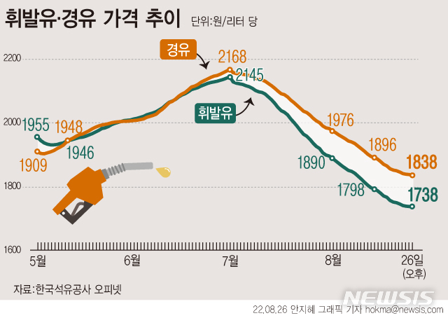![[서울=뉴시스] 권창회 기자 = 국내 기름값이 두달 연속 하락세를 지속하는 가운데 서울에서는 휘발유 가격이 리터(ℓ)당 1600원대, 경유 가격 1700원대인 주유소도 보이고 있다. 한국석유공사 유가정보사이트 오피넷에 따르면 휘발유 평균 판매 가격은 전일 대비 1.31원 하락한 ℓ당 1738.54원, 경유 판매 가격은 1.19원 내린 1838.60원을 기록했다. 사진은 26일 오전 서울 시내 한 주유소에 유가 정보가 표시되어 있다. 2022.08.26. kch0523@newsis.com](https://img1.newsis.com/2022/08/26/NISI20220826_0019173937_web.jpg?rnd=20220826114205)