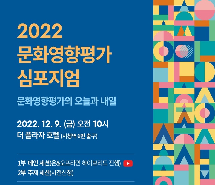 1부 메인 세션에서는 ▲2022년 문화영향평가 성과보고(김연진 한국문화관광연구원 연구위원) ▲문화영향평가의 새로운 방향(정준호 전북대 교수) 기조발제와 평가 유형별 대표사례 소개가 진행된다.