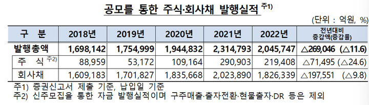 [서울=뉴시스]우연수 기자 = 대형 기업공개(IPO) 실종으로 지난해 주식 발행액이 25% 줄었다. 금리 인상 등으로 발행 여건 악화되면서 회사채도 10% 줄었다.