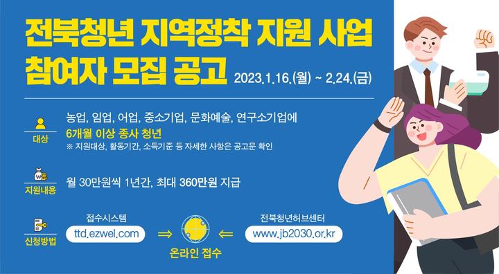 군은 전북형 청년수당인 '전북청년 지역정착 지원사업' 참여자를 내달 24일까지 모집한다고 27일 밝혔다.