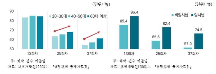 김동겸 보험연구원 연구위원은 개인생명보험과 장기손해보험의 유지율 모두 IMF 사태, 신용카드 대란, 글로벌 금융위기 등 경제불황기에 하락, 경제환경 변화에 영향을 받는다고 분석했다. 실제로 개인생명보험의 25회차 보험계약 유지율은 1998년(IMF 사태) 37.4%, 2004년(신용카드 대란) 58.4%, 2010년(글로벌 금융위기) 57.0%로 하락했다. 장기손해보험의 경우도 유사한 패턴을 보였다.