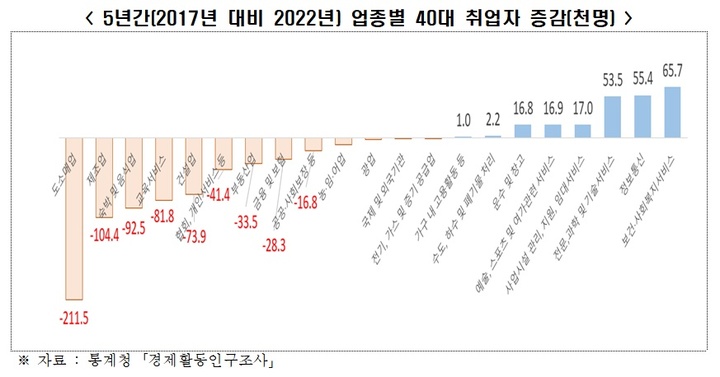 5년간 업종별 40대 취업자 변화를 살펴보면 ▲도소매업(-21.2만명) ▲제조업(-10.4만명) ▲숙박 및 음식업(-9.3만명) ▲교육서비스업(-8.2만명) ▲건설업(-7.4만명) 등의 순으로 감소했다.