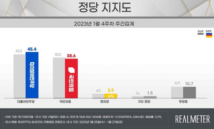 정당 지지도는 더불어민주당은 2.1%포인트가 오른 45.4%, 국민의힘은 1.6%포인트 내린 38.6%로 나타났다. 양당 간 격차는 지난주 3.1%포인트에서 6.8%포인트로 벌어졌다.