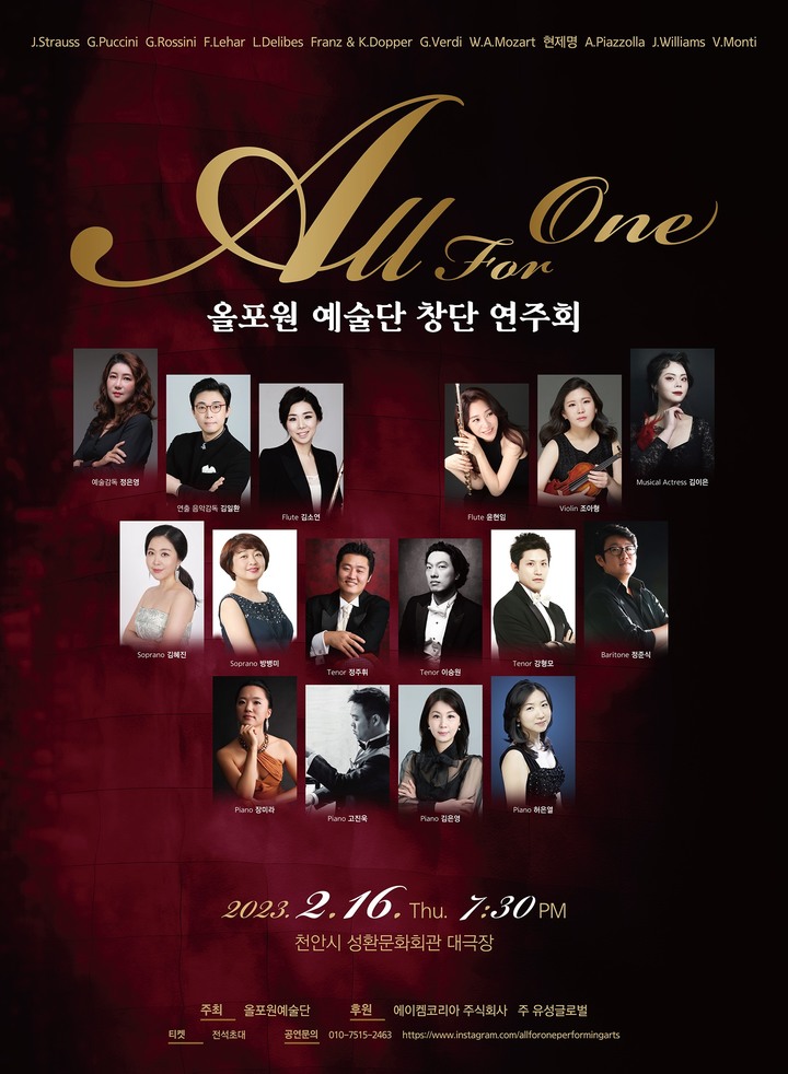 [천안=뉴시스]박우경 기자 = 민간 예술단체인 올포원예술단(All For One Performing Arts)의 창단 연주회가 내달 16일 오후 7시30분 천안시 성환문화회관 대공연장에서 열린다.