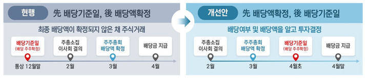 당국은 3·6·9월 말일의 주주를 배당받는 주주로 정한 내용을 삭제해 배당을 결정하는 이사회 결의일 이후로 배당기준일을 정할 수 있도록 할 예정이다. 이사회 배당 결의 이후를 배당기준일로 정할 경우, 배당금 지급 준비 기간이 부족할 수 있어 지급 기간을 20일에서 30일로 연장한다.