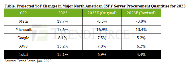 이 업체는 지난해 10월 전 세계 서버시장 규모가 전년 대비 3.7% 성장할 것이라는 예상치를 내놨다가 한 달만에 2.8% 하향 조정했는데 또다시 전망치를 낮춘 것이다. 트렌드포스는 "글로벌 경제 역풍에 직면한 4개의 주요 북미 클라우드 서비스 공급자(CSP)는 2023년 서버 조달 물량을 축소했다"고 밝혔다.