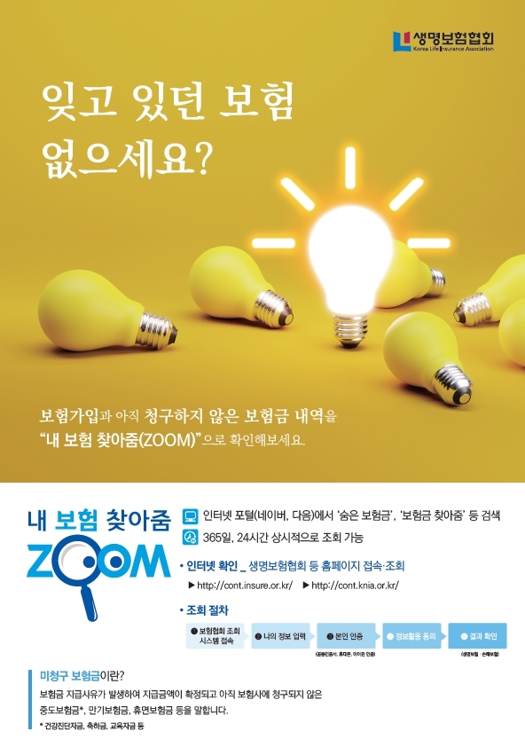 3일 생명보험협회에 따르면 생·손보협회는 2017년부터 휴면보험금뿐만 아니라 자녀교육자금, 배당금, 생존연금 등 보험소비자가 찾아가지 않은 중도보험금과 만기보험금, 가입 보험계약 내역을 조회할 수 있는 '내보험 찾아줌' 서비스를 시작했다. 보험소비자는 이 서비스를 통해 온라인으로 본인의 보험정보를 별도의 회원 가입이나 비용 부담 없이 실시간 조회하고, 손쉽게 보험금을 신청할 수 있다.