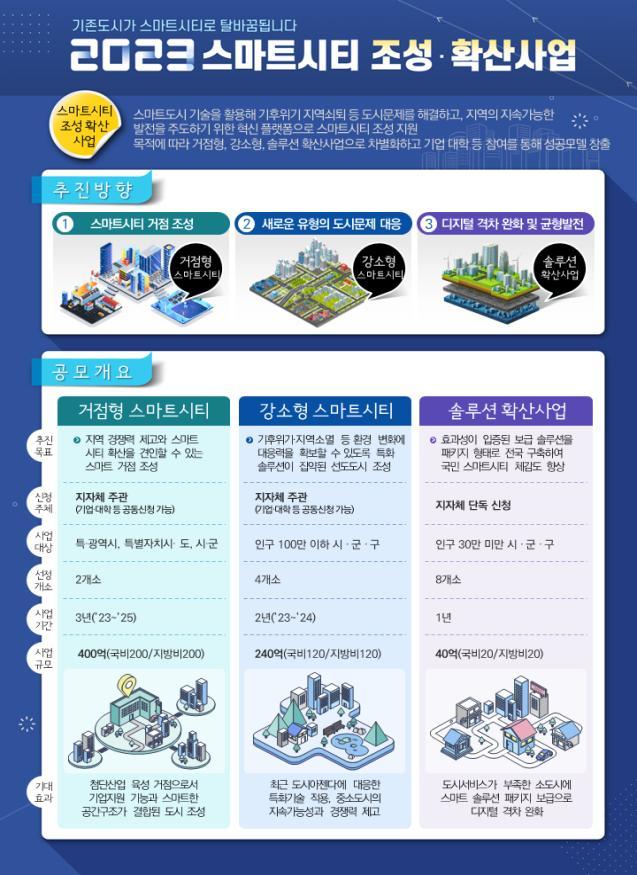 정부는 올해 솔루션 확산사업과 도시전역에 종합솔루션을 실증해 스마트시티 거점을 조성하는 거점형 사업과 기후위기, 지역소멸 등 환경변화에 대응하기 위한 선도도시를 조성하기 위한 강소형 스마트시티 사업을 새로 도입한다.