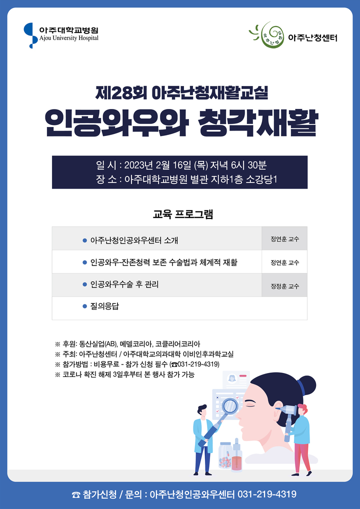 강연은 난청과 인공와우에 관심이 있는 시민은 누구나 무료로 참가할 수 있다. 다만 참가 신청은 필수다. 자세한 내용은 아주난청센터로 문의하면 된다.