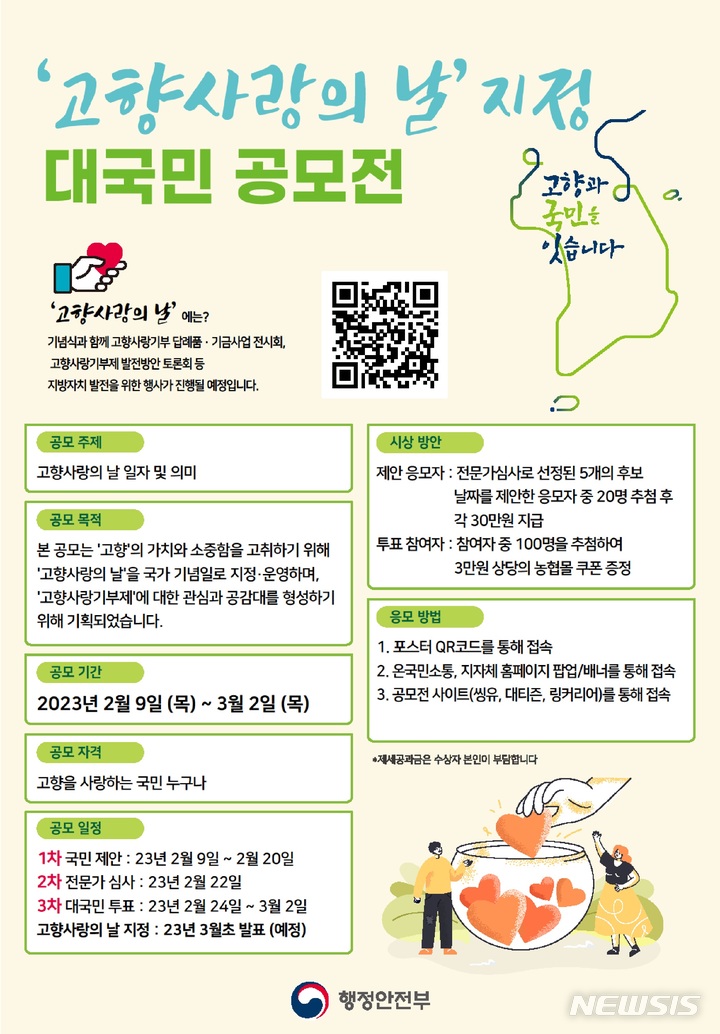 행정안전부는 오는 9일부터 다음달 2일까지 고향사랑의 날 대국민 공모를 실시한다고 8일 밝혔다.