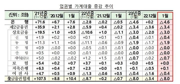 9일 금융위원회가 발표한 '2023년 1월중 가계대출 동향'에 따르면 지난달 전 금융권 가계대출은 전월(-3조4000억원) 대비 8조원 줄어들며 지난해 하반기 이후의 감소추세를 지속했다.
