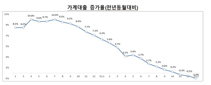전년동월 대비 증감률은 -1%를 나타내 감소폭이 더욱 커졌다. 가계대출 증가율은 2021년 4월 10%까지 치솟았으나 지난해 12월 -0.5%로 떨어진 데 이어, 이번에 -1%대까지 내려갔다.