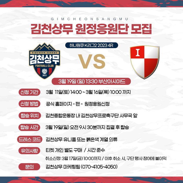 [김천=뉴시스] 박홍식 기자 = 김천상무가 부산 아이파크전 원정 응원단을 모집한다.