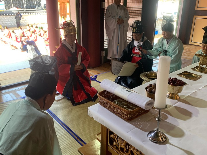 초헌관이 향을 피우고 폐백을 올리는 전폐례로 시작해 초헌례, 아헌례, 종헌례, 음복례, 망예례 순으로 진행됐다.