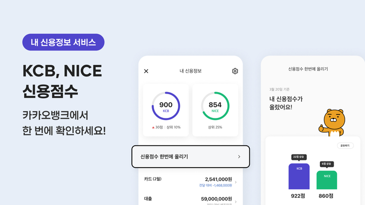 [서울=뉴시스] 이정필 기자 = 카카오뱅크는 '내 신용정보 서비스'에서 코리아크레딧뷰로(KCB)와 NICE평가정보의 신용점수를 모두 확인할 수 있도록 서비스를 확대한다고 22일 밝혔다.