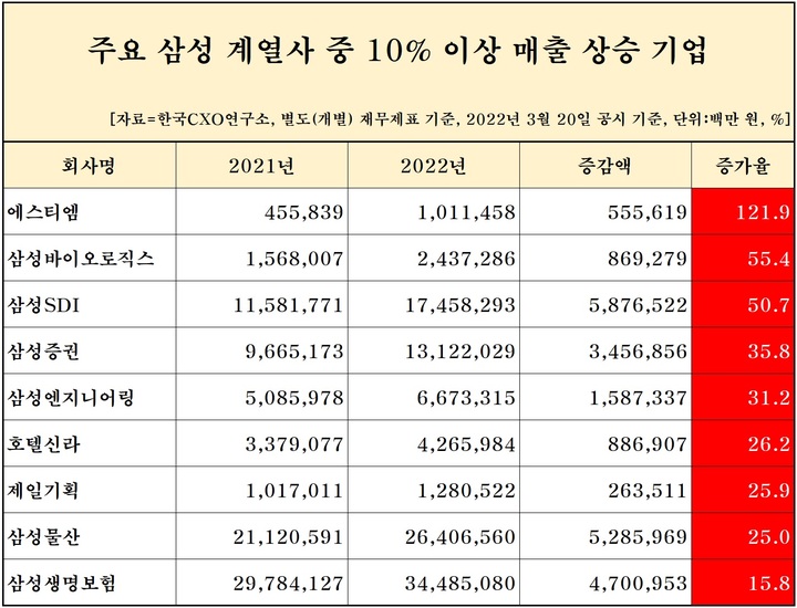 이외 ▲삼성바이오로직스 55.4%(2021년 1조5680억원→2022년 2조4372억원) ▲삼성SDI 50.7%(11조5817억원→17조4582억원) ▲삼성증권 35.8%(9조6651억원→13조1220억원) ▲삼성엔지니어링 31.2%(5조859억원→6조6733억원) ▲호텔신라 26.2%(3조3790억원→4조2659억원) ▲제일기획 25.9%(1조1701억원→1조2805억원) ▲삼성물산 25%(21조1205억원→26조4065억원) ▲삼성생명 15.8%(29조7841억원→34조4850억원) 순으로 최근 1년 새 매출 외형이 10% 넘게 증가했다.